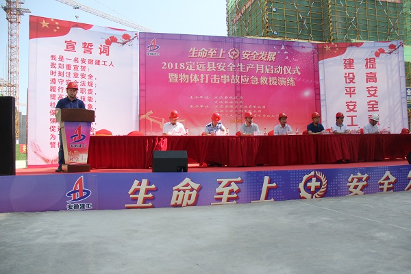 6月12日,定遠(yuǎn)縣在徽鹽曲陽現(xiàn)代城開展了以“生命至上,安全發(fā)展”為主題的2018年安全生產(chǎn)月啟動儀式暨物體打擊事故應(yīng)急救援演練活動。縣直相關(guān)職能單位規(guī)建局、安監(jiān)局、公安局、衛(wèi)計委等負(fù)責(zé)人、徽鹽地產(chǎn)副總經(jīng)理黎元忠、徽鹽地產(chǎn)定遠(yuǎn)項目相關(guān)人員等出席了活動。